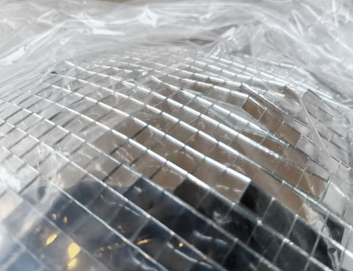 • Ook leverbaar in B-keuze: sommige spiegelstrips zijn niet helemaal netjes geplakt, waardoor er een bolling in de spiegelstrip is ontstaan, zie foto. Dit doet niets af aan de werking, de spiegels vallen er ook niet af. Je kunt het prima zo laten, of het herstellen door met een glassnijdertje een spiegeltje in de rij smaller te maken. Deze discobollen zijn heel scherp geprijsd!