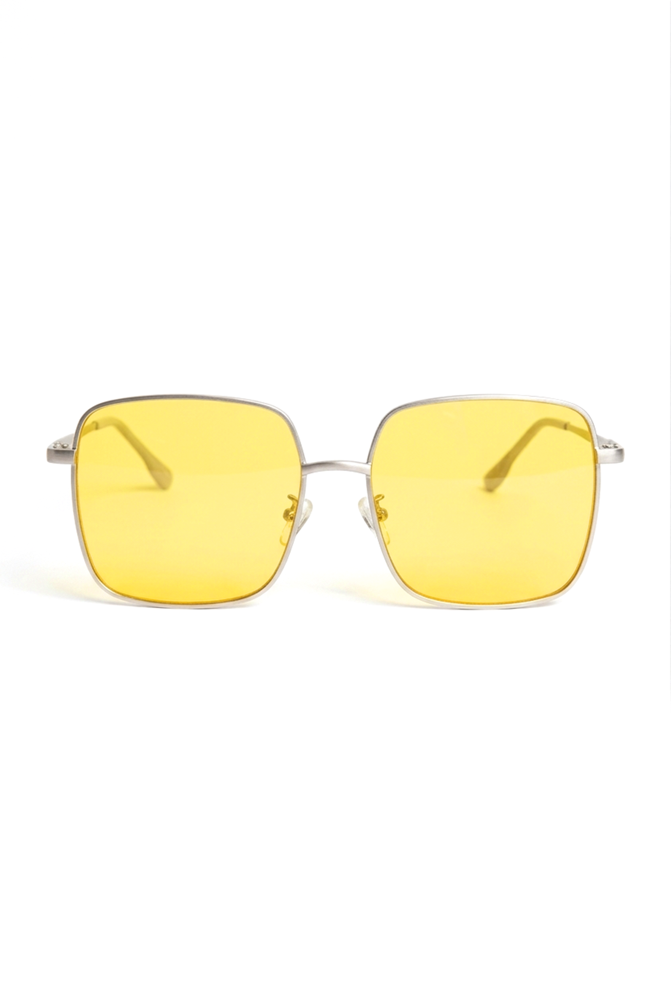 • Zonnebril met een oversized zilver montuur en gele glazen,