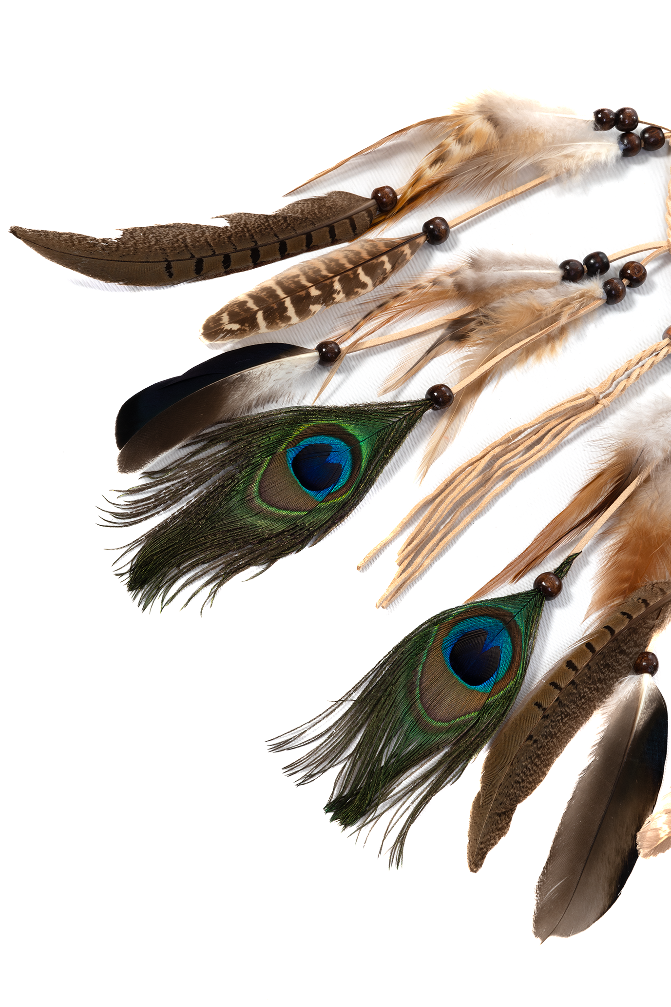 • Hoofdband van gevlochten leren veter met pauwen- en bruine veertjes met beschilderde houten kraaltjes,