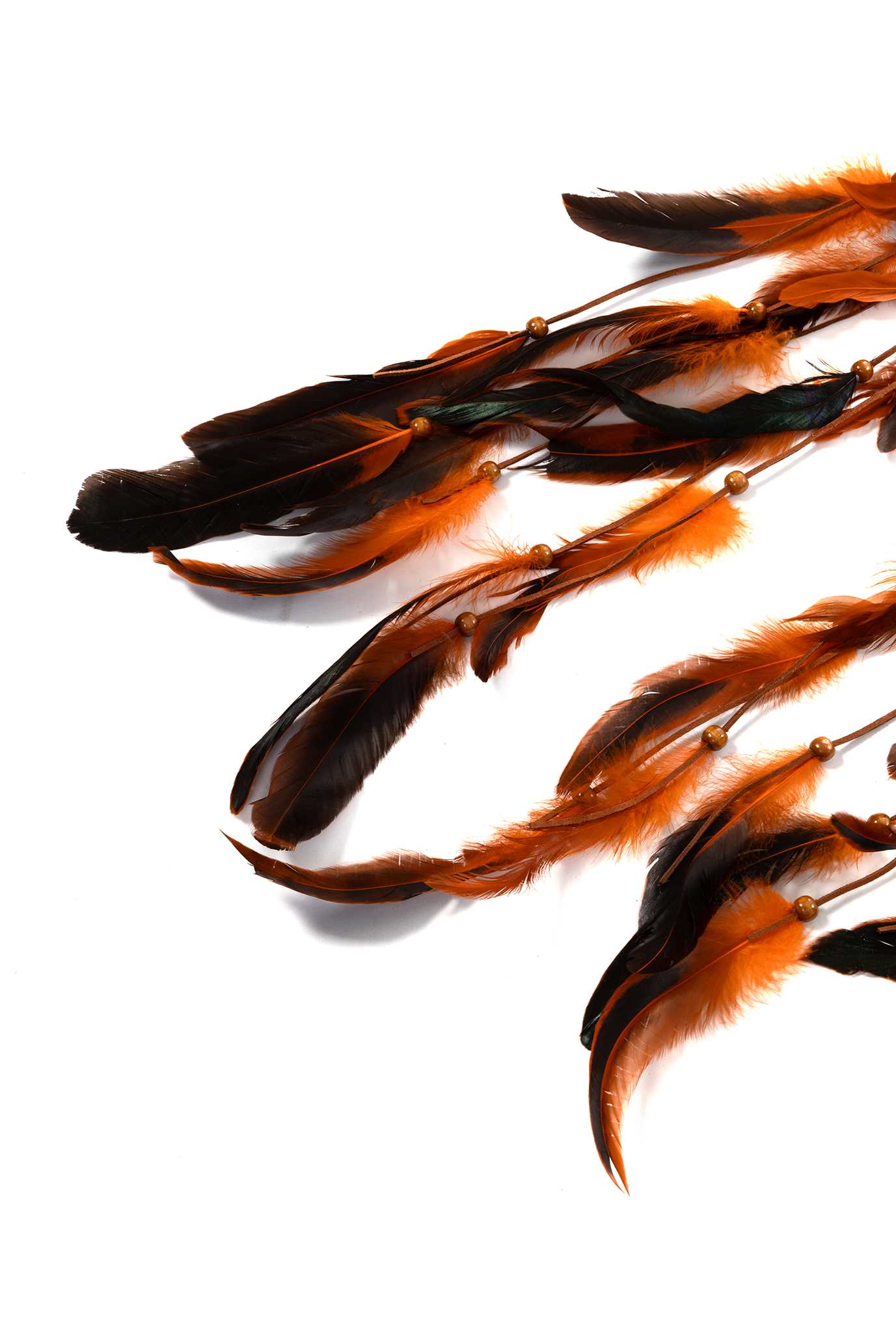 • Hoofdband van gevlochten leren veter met oranje en zwarte veertjes met beschilderde houten kraaltjes,