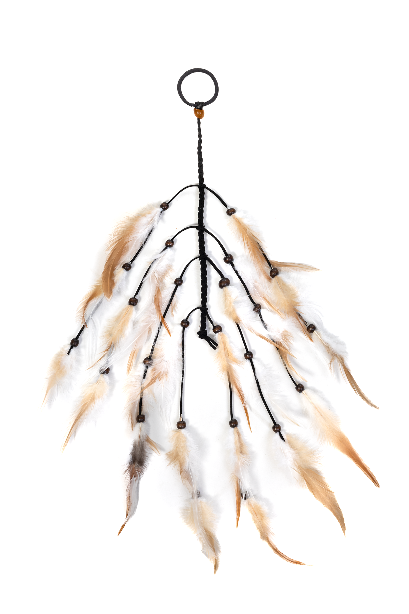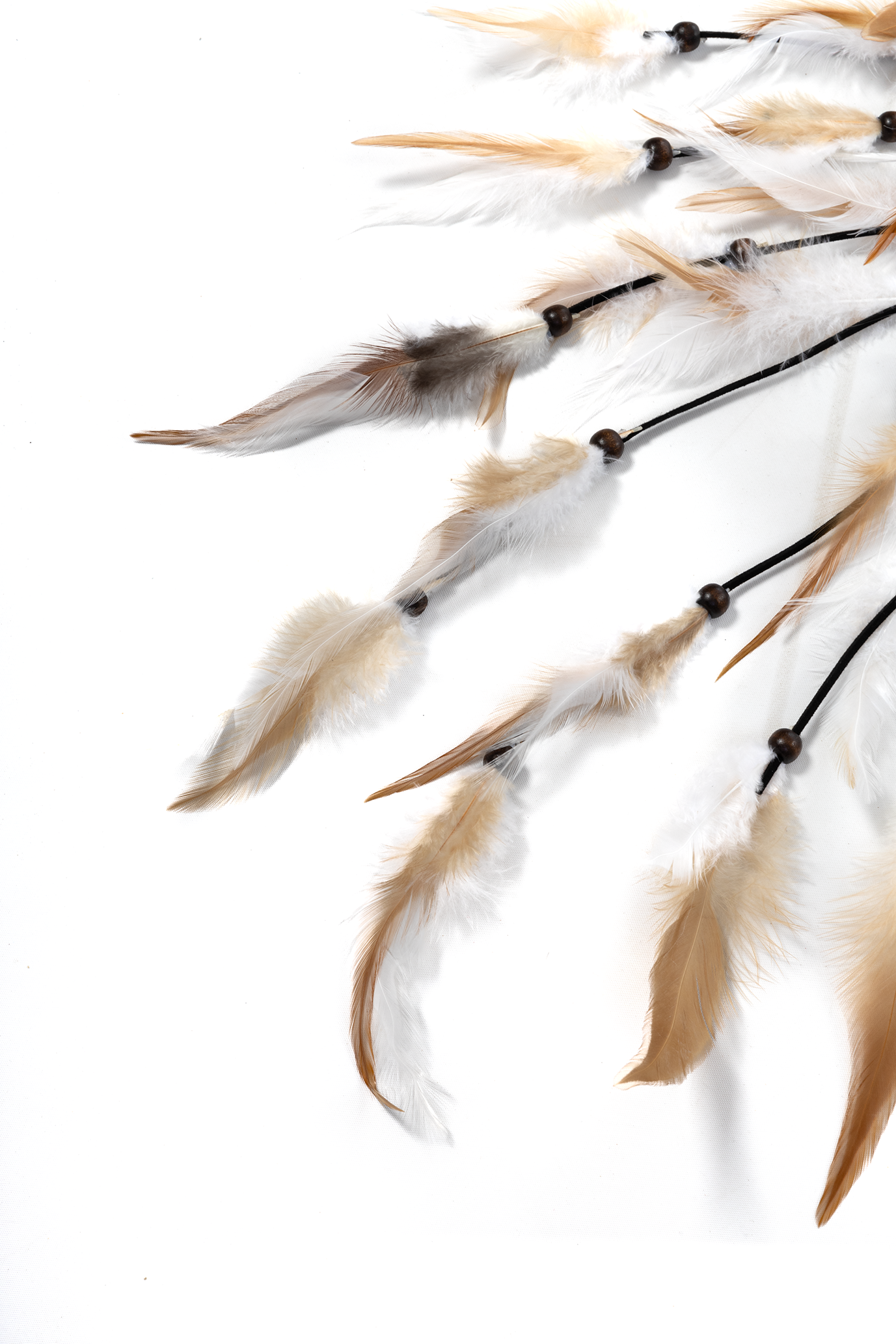 • Hoofdband van gevlochten leren veter met witte en bruine veertjes met beschilderde houten kraaltjes,