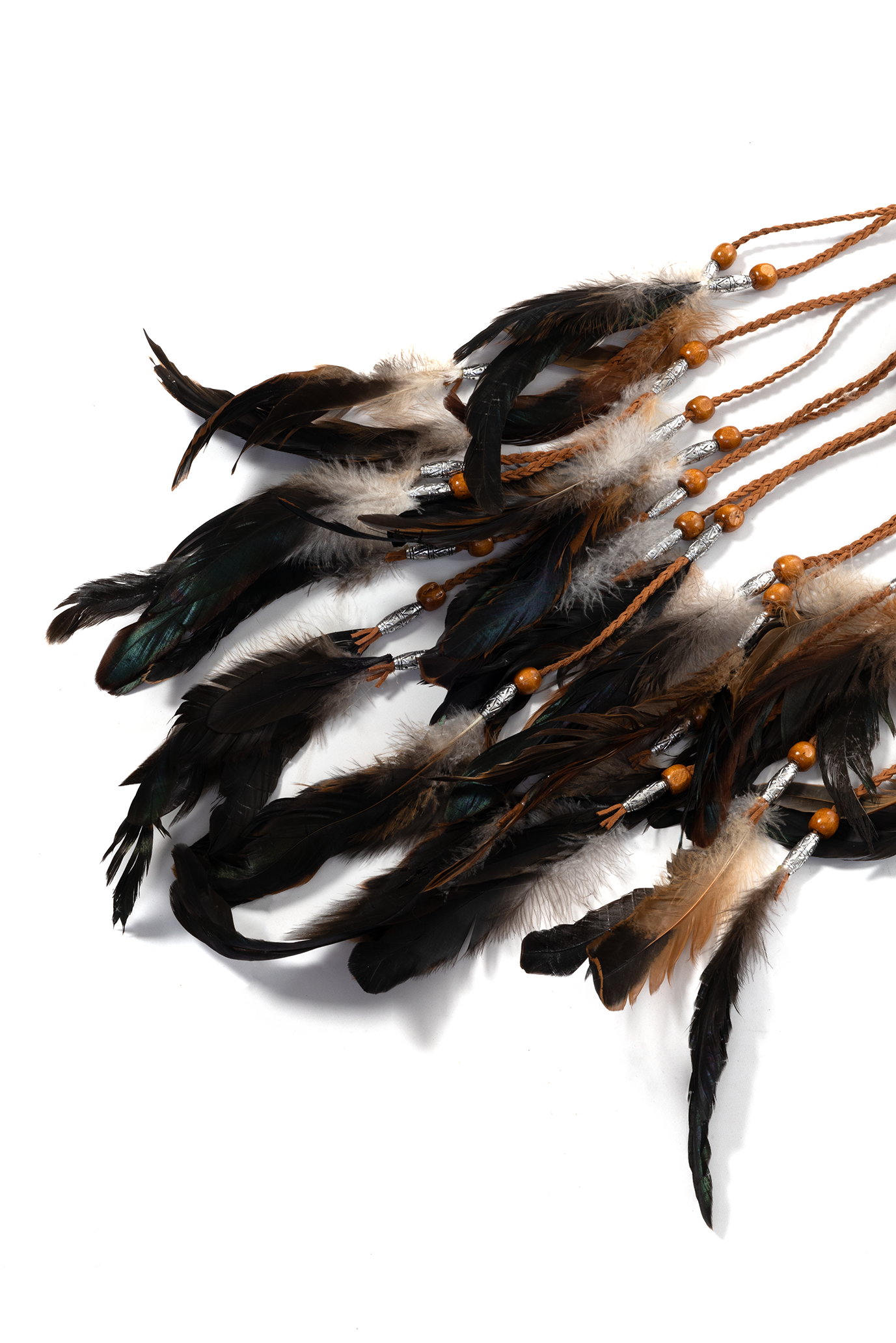 • Hoofdband van gevlochten leren veter met zwarte, witte en bruine veertjes met beschilderde houten kraaltjes,