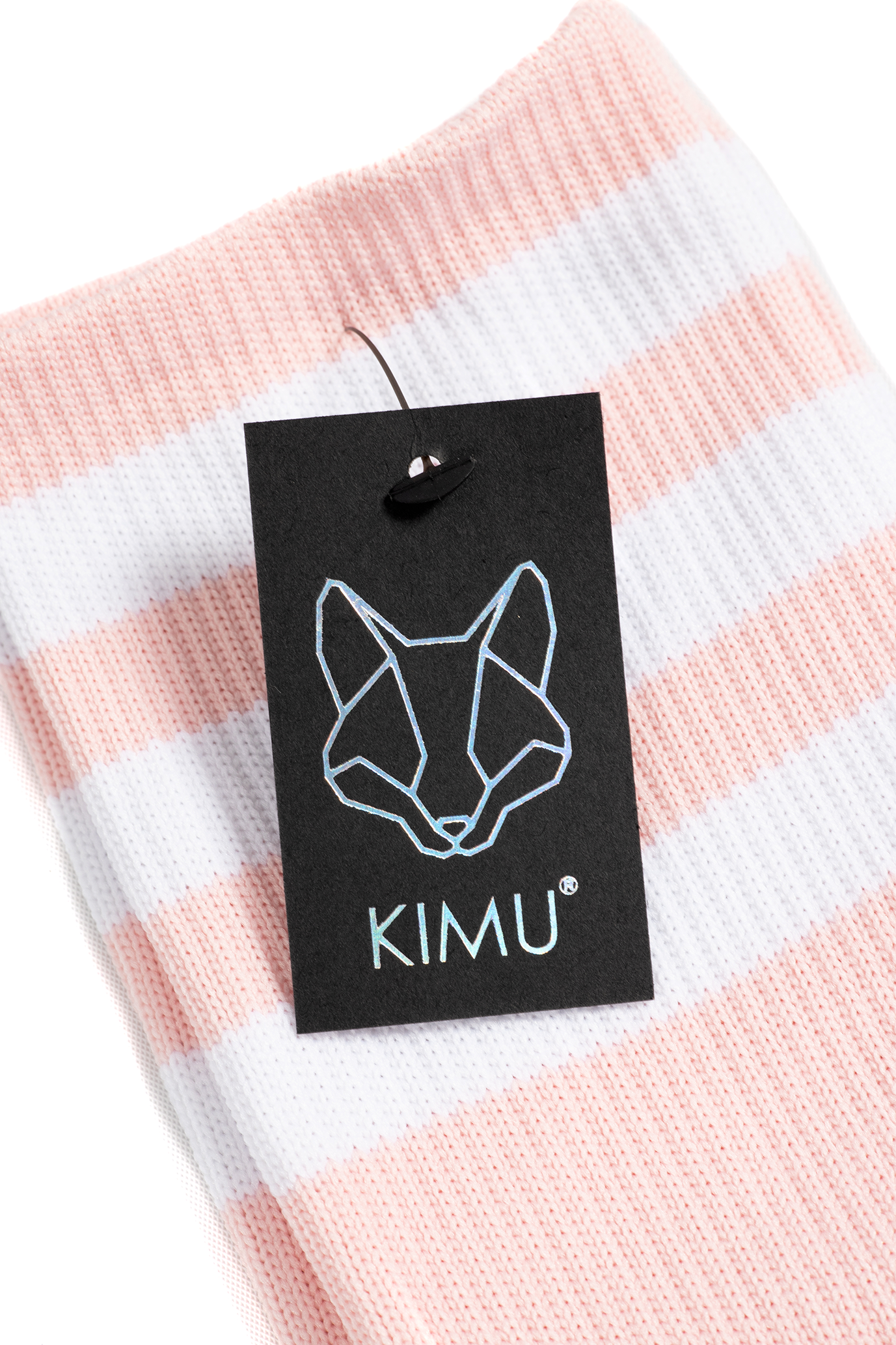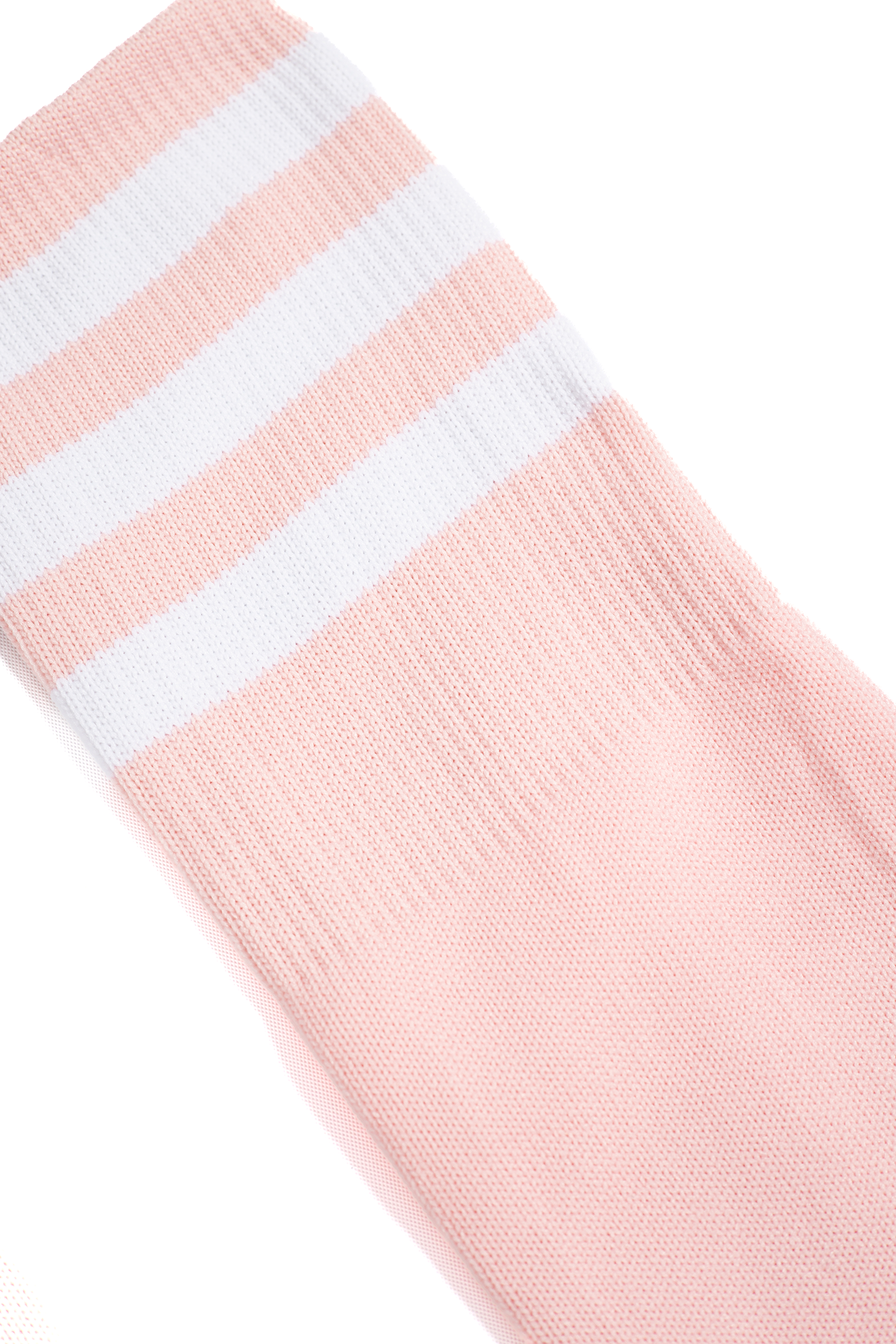 - Lange overknee kousen in het lichtroze met drie witte strepen,