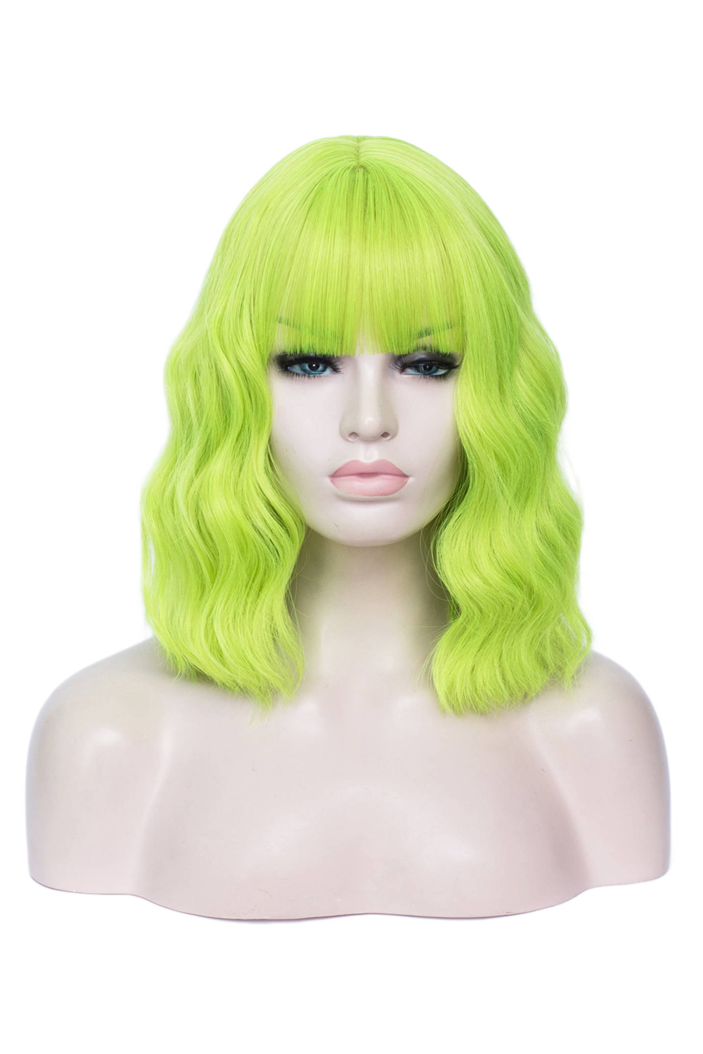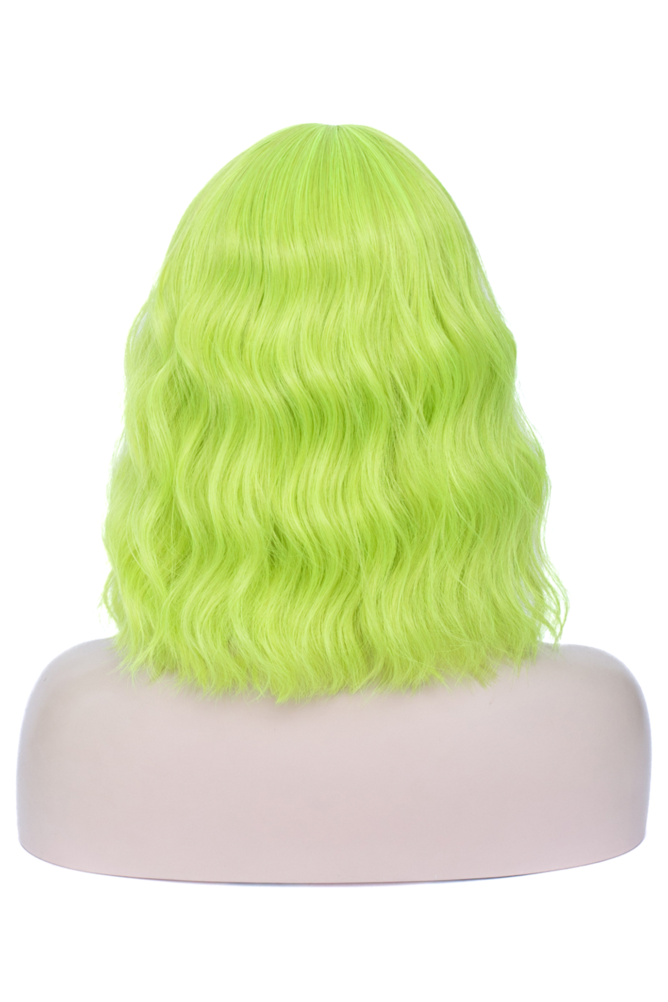 - Limegroene pruik met grove slag en rechte pony,