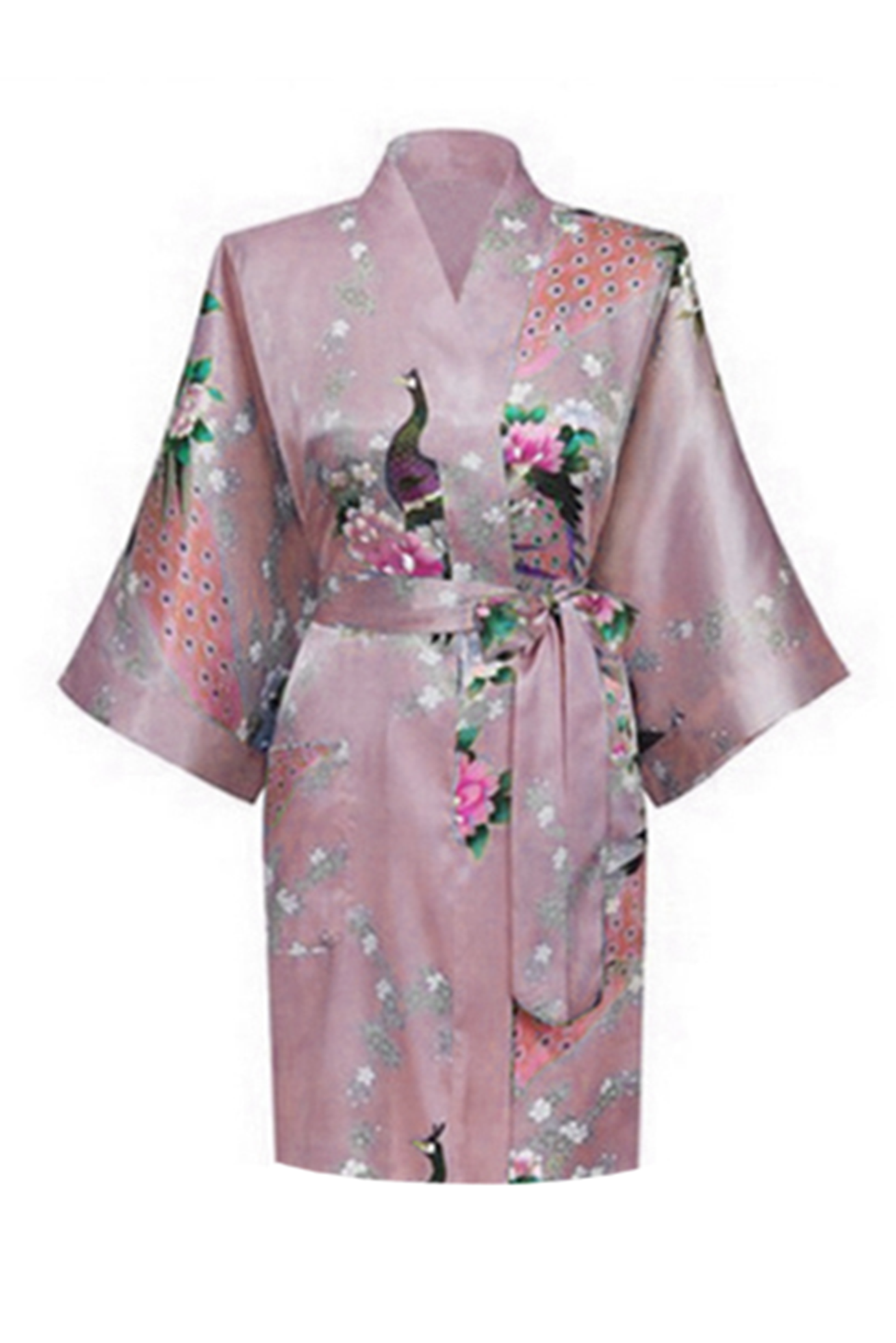 - Mauve geisha kimono met Japanse print met bloesem en pauwen,