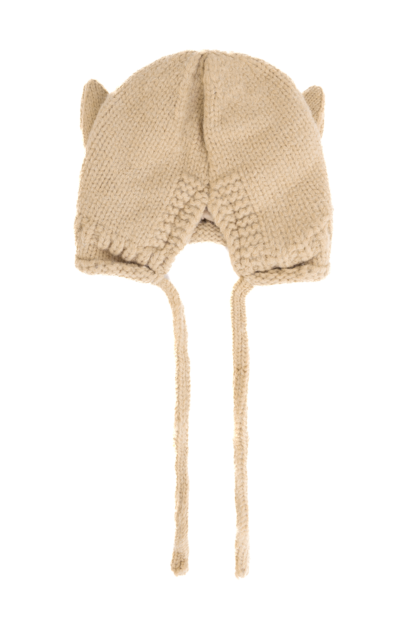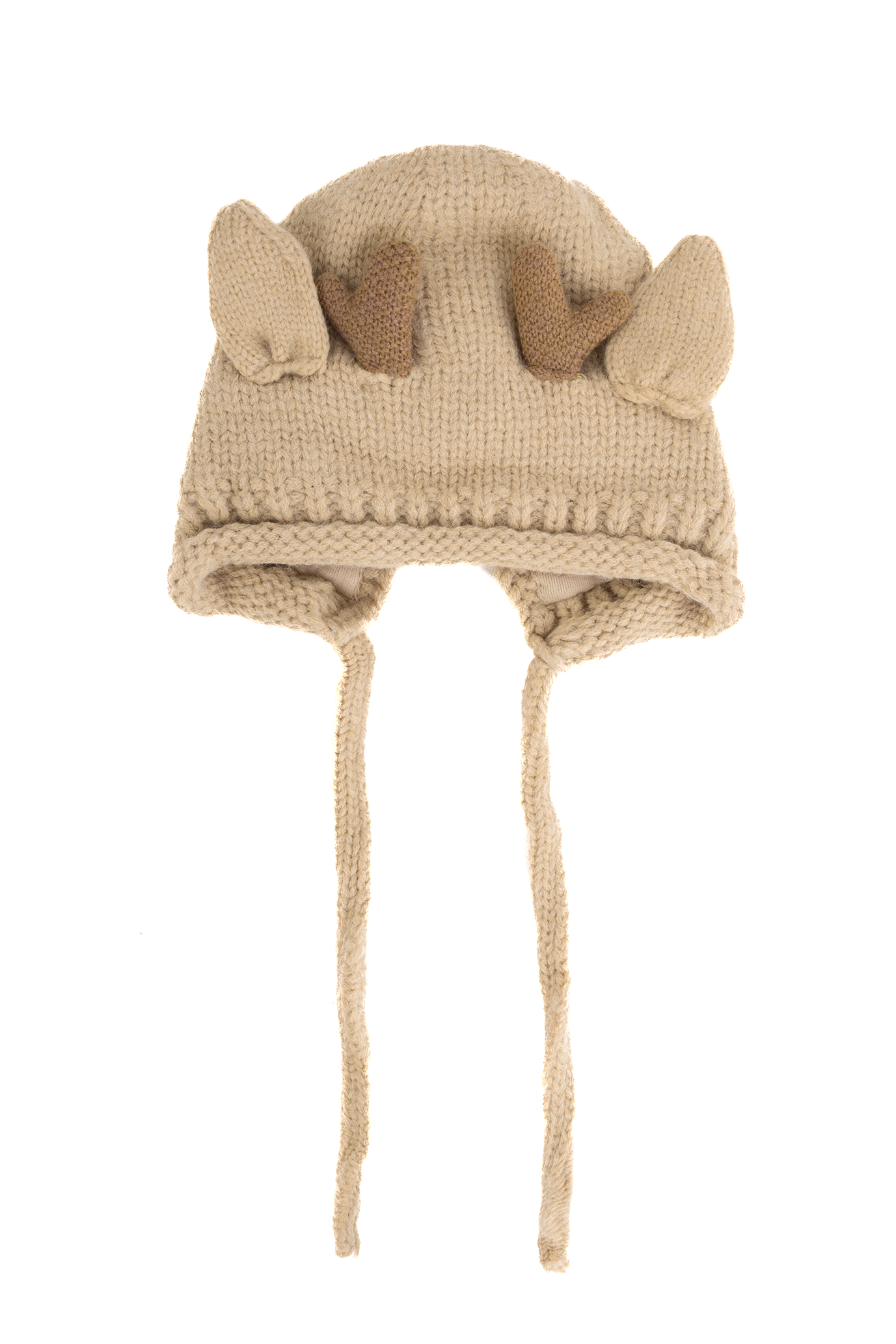 • Beigekleurige gebreide rendieren muts met gewei oortjes en touwtjes,