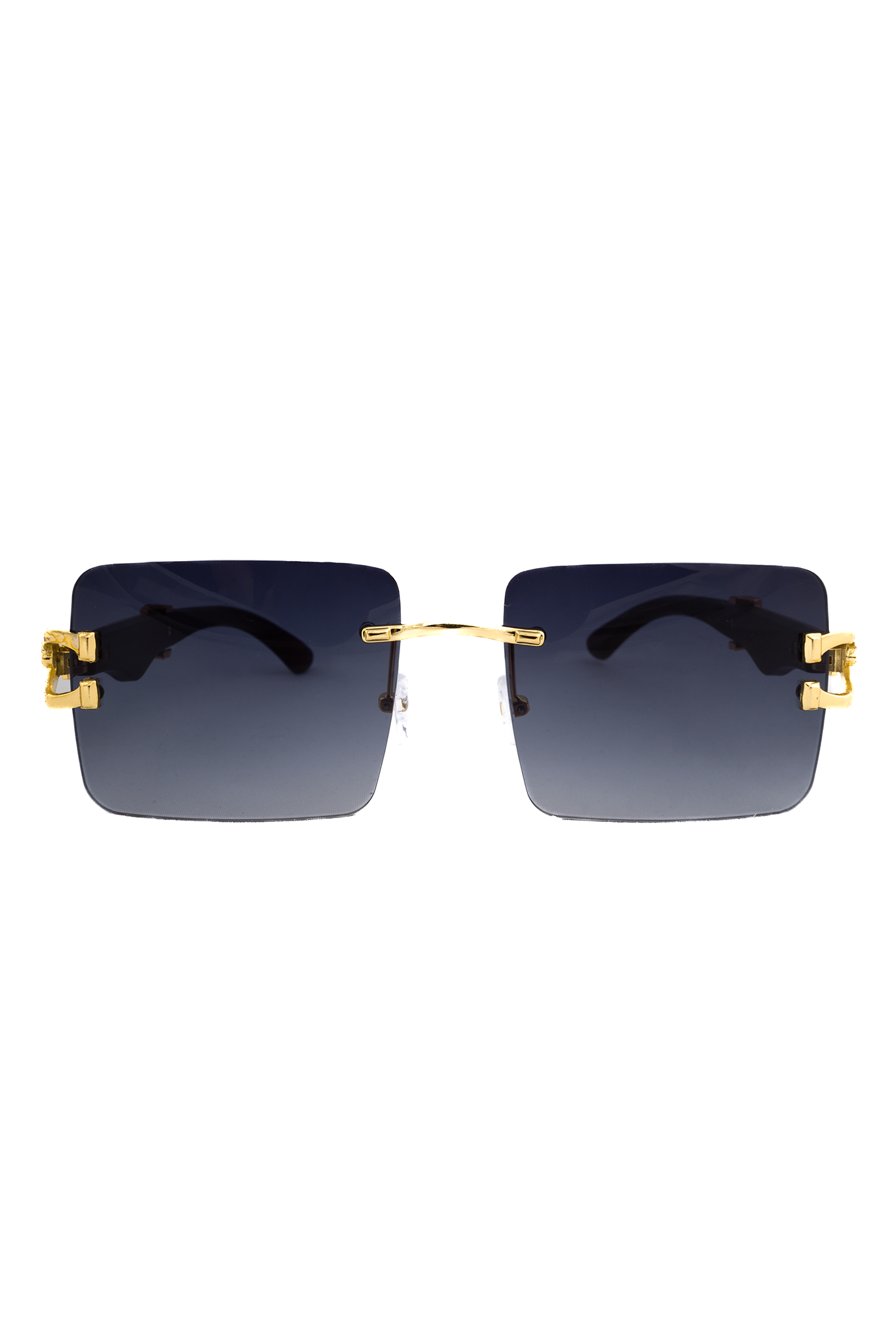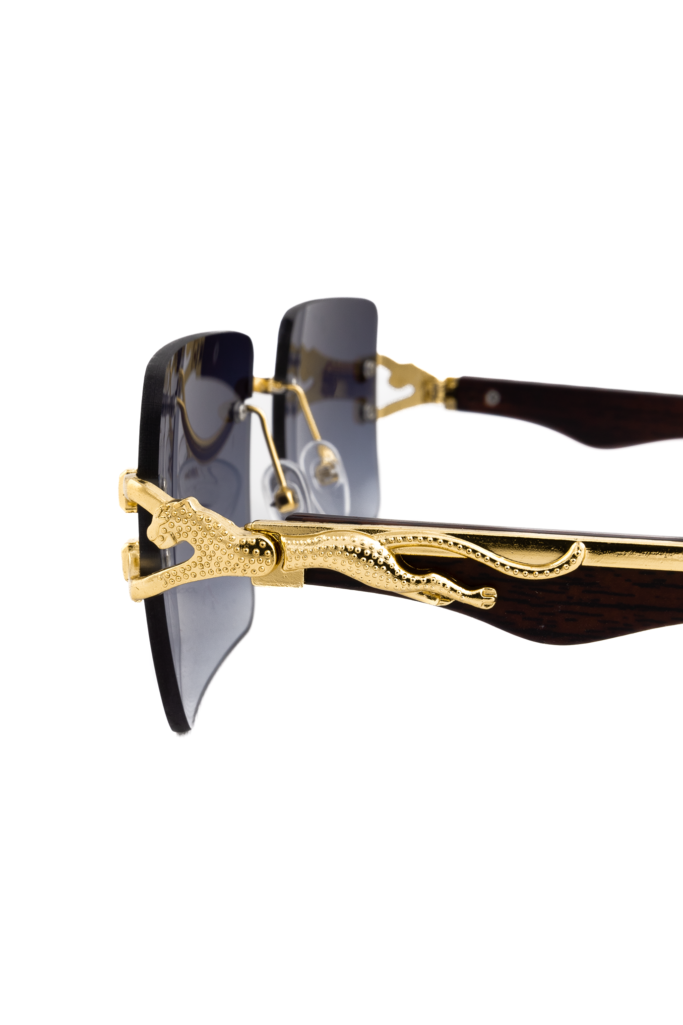 - Zonnebril met blauwe gradient glazen en gouden montuur met panters op de pootjes,