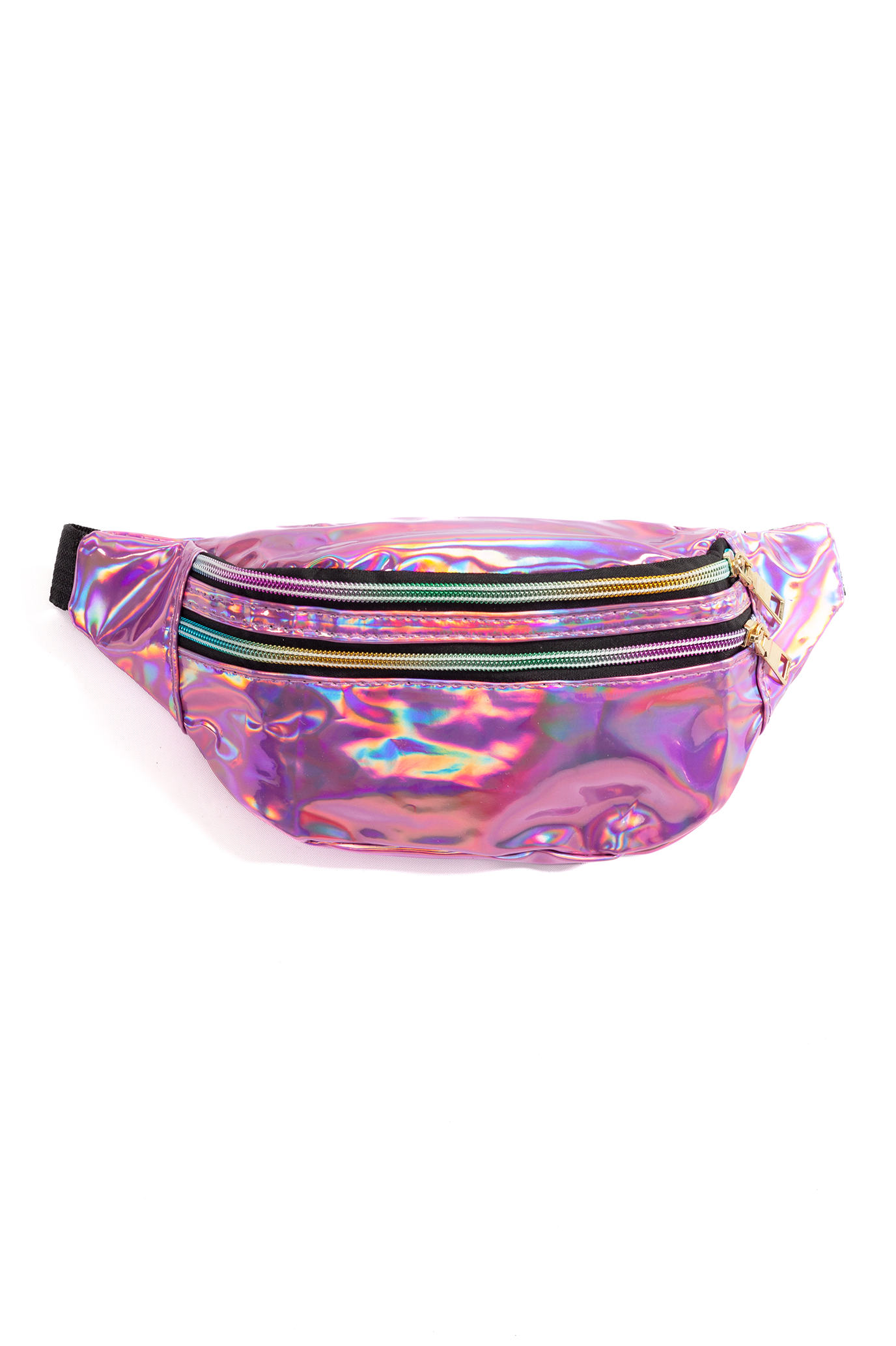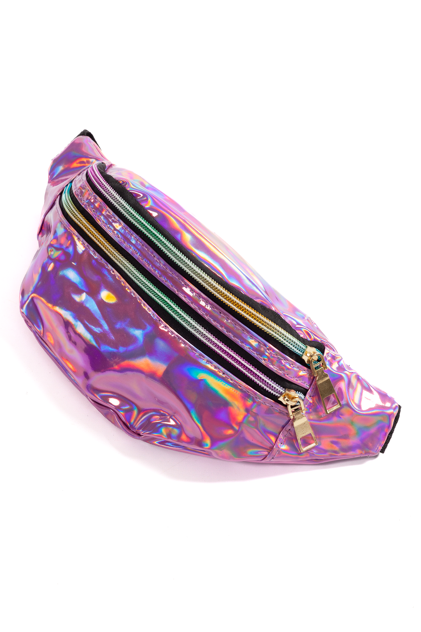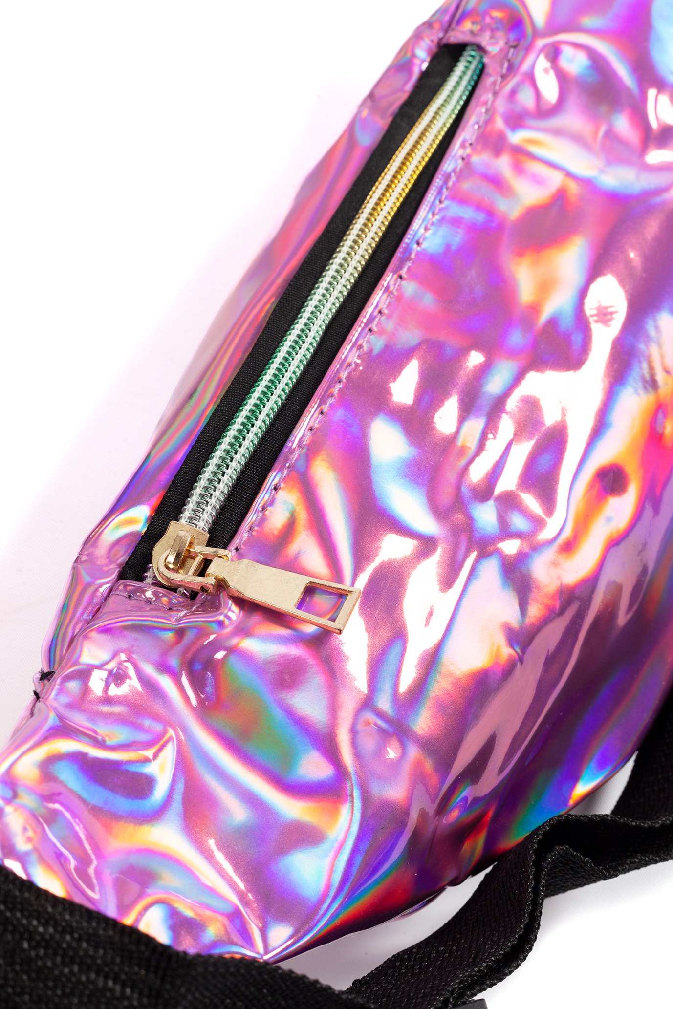 • Roze iridescent heuptas holografisch met twee ritsen,