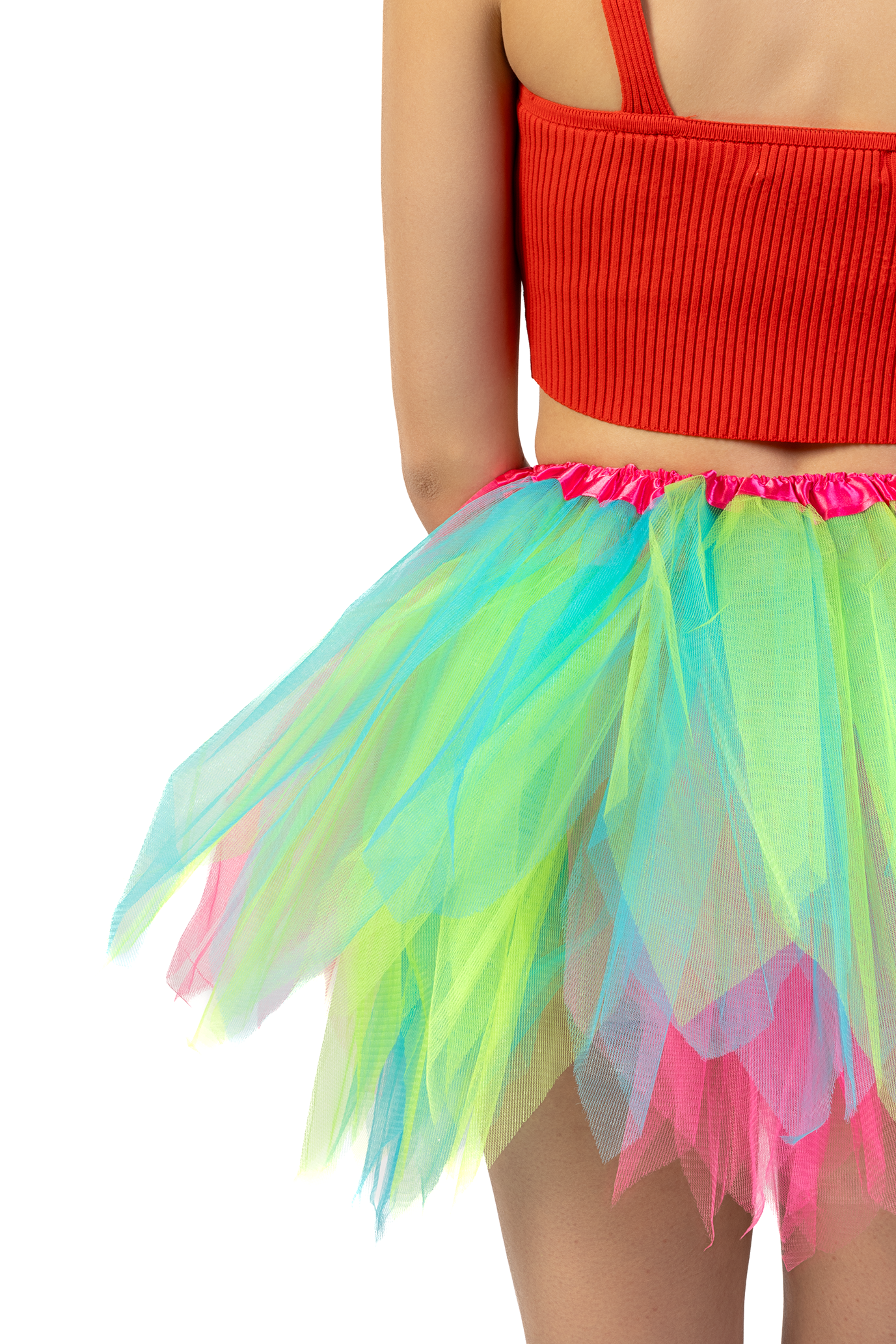 - Tutu rokje met roze, groene en blauwe stroken tule stof in drie lagen,