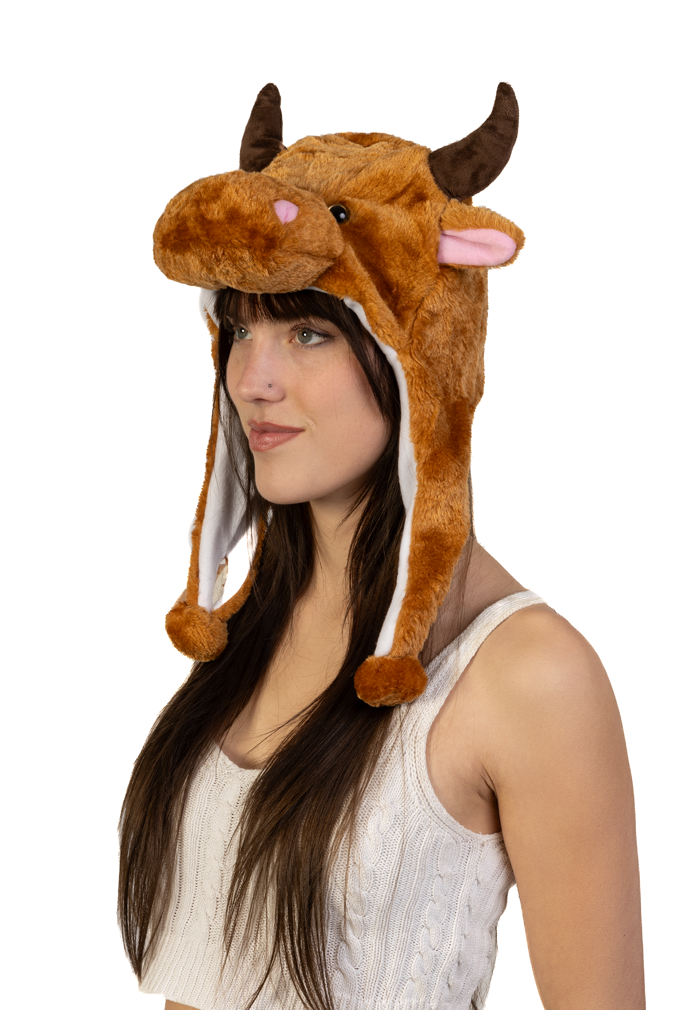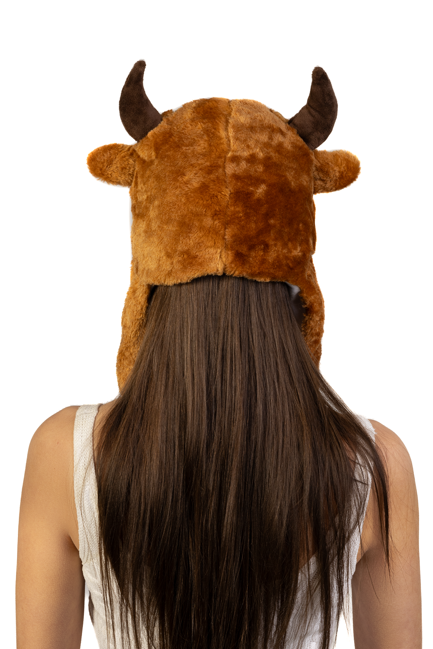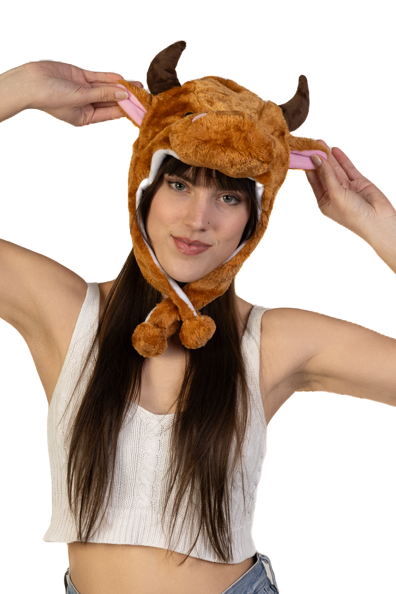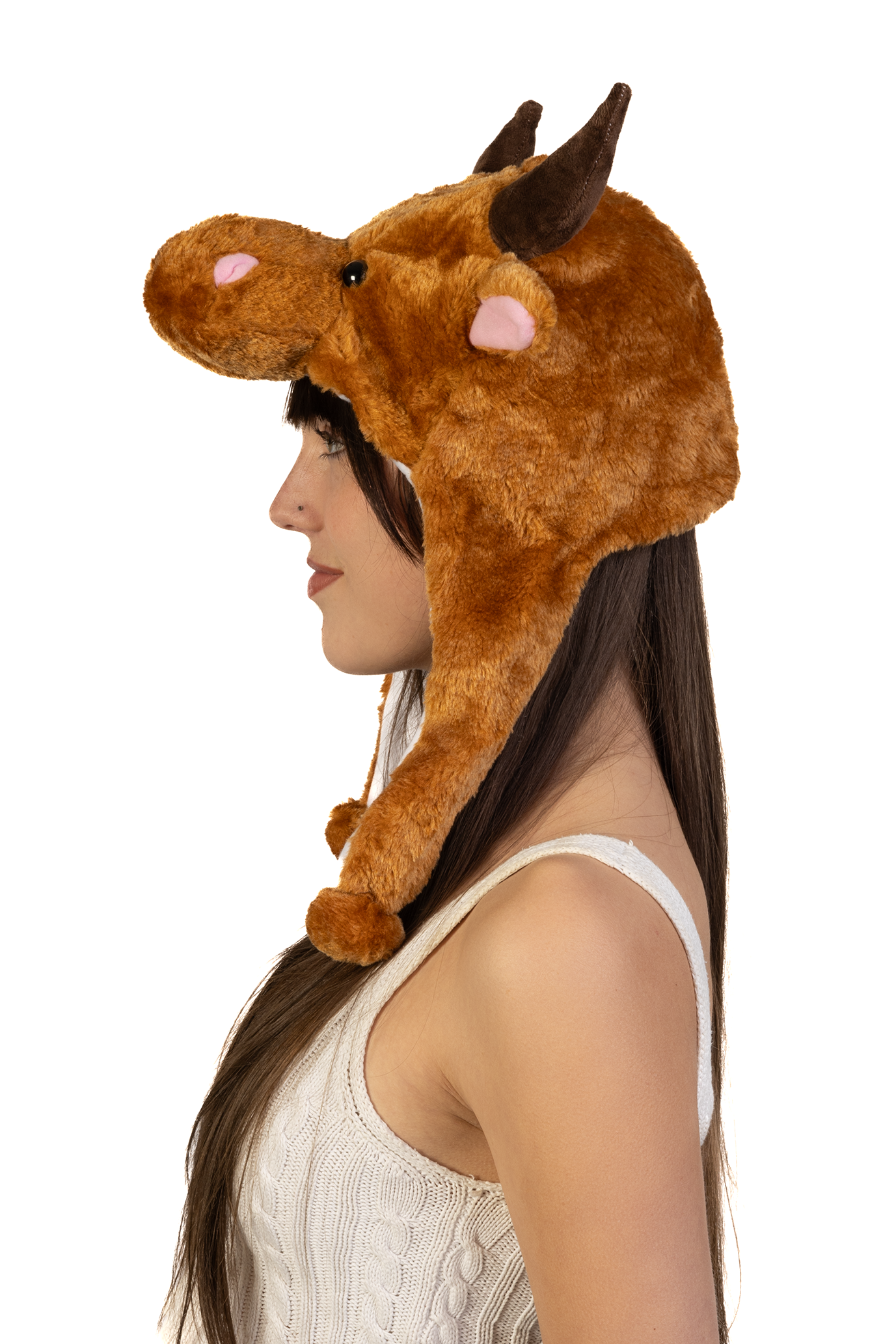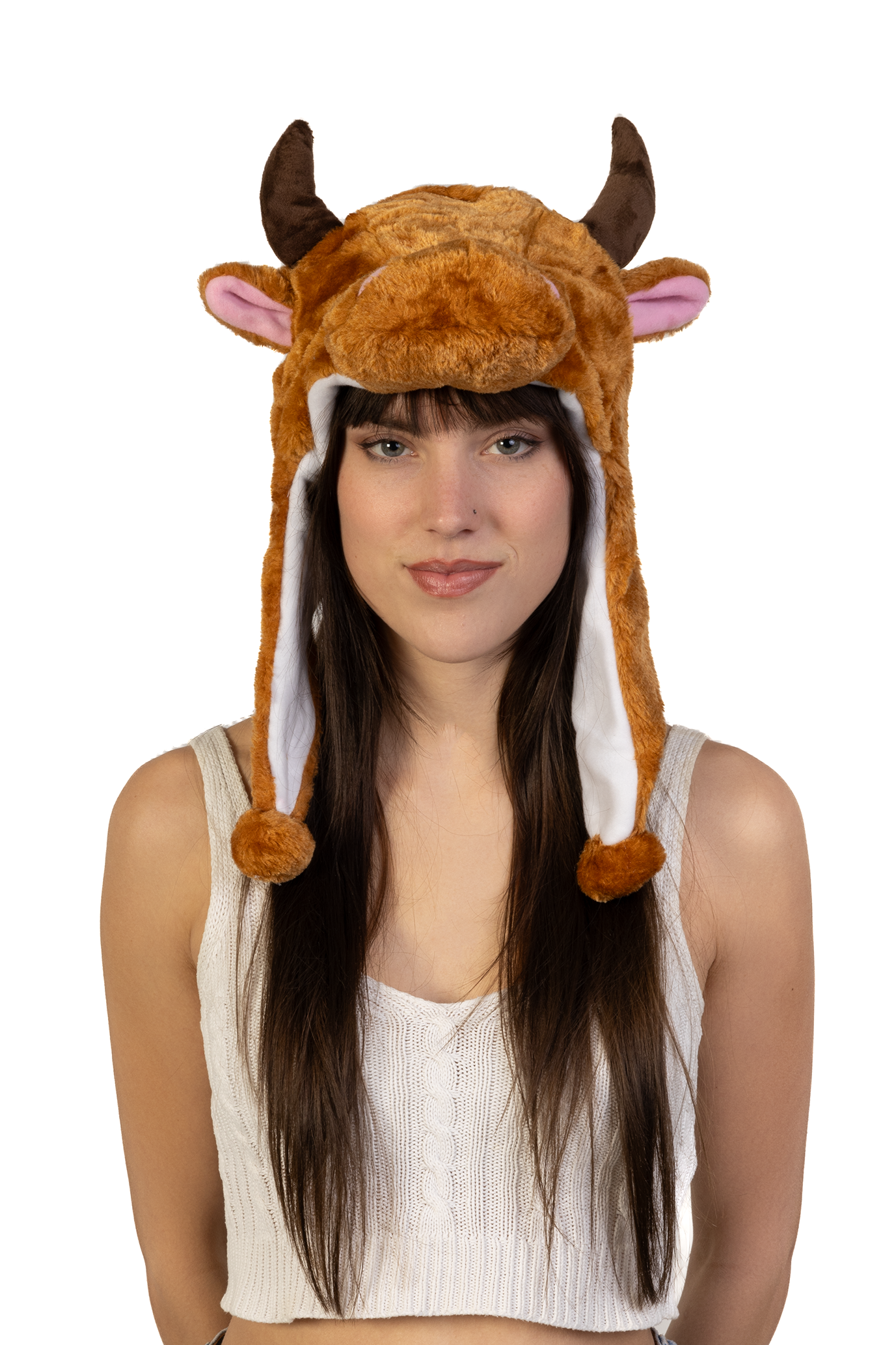 Maak een stoer én schattig statement met deze unieke stierenmuts! Trotseer de kou in stijl en koop hier jouw Stier Donkerbruin Muts Flappen Laplander Oortjes Koe Flapmuts Pluche!
